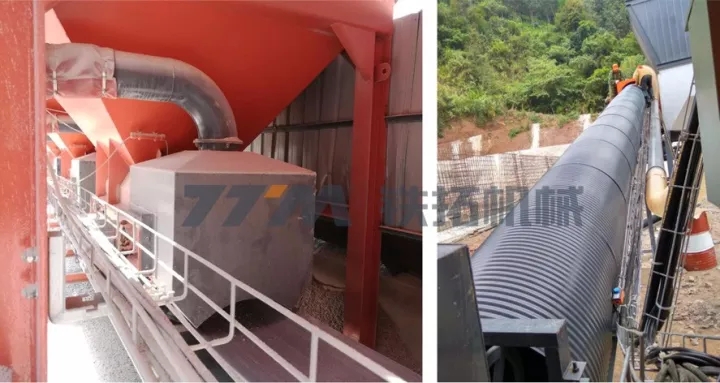 环保型沥青搅拌设备冷料系统的每个冷料仓三面增加包装版(或者采用地仓形式),在皮带机以及皮带机对接处增加密封罩子,同时增加布袋除尘器将每个冷料仓顶部、喂料皮带机出料口以及皮带机密封罩通过管道连接起来,解决装载机上料和皮带机输送时产生的扬尘问题。