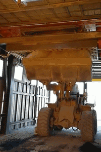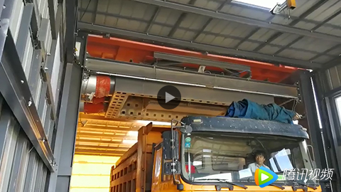 在车道上设置封闭的卸料区,同时在成品仓卸料口处设有吸尘管道,装料车在封闭卸料区内卸料,产生的蓝烟和粉尘利用燃烧器风机引入燃烧器进行二次燃烧,解决烟尘外溢问题。