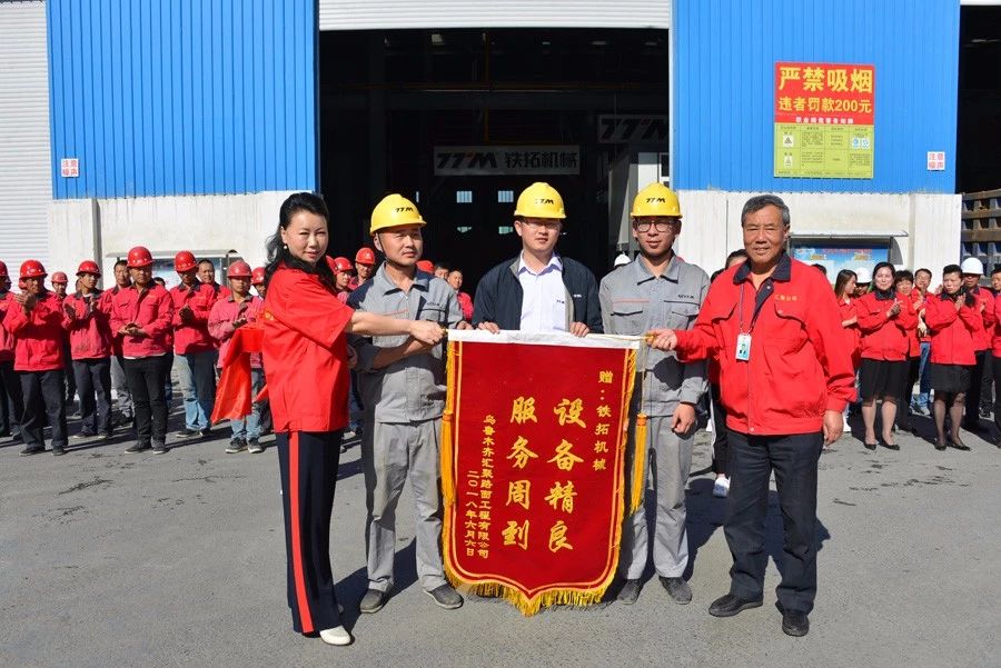 剪彩仪式结束后,隋思玉董事长亲自赠予铁拓机械“设备精良,服务周到”红色大锦旗,对铁拓机械在项目实施过程的各项工作给以肯定。
