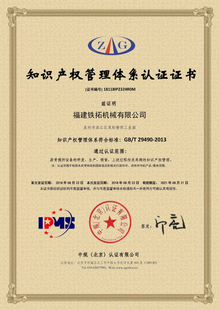 近日,福建铁拓机械有限公司经过中规(北京)认证有限公司的层层严格审核,被认定为完全符合GB/T29490-2013知识产权管理体系标准的公司,并获得其颁发的知识产权管理体系认证证书。