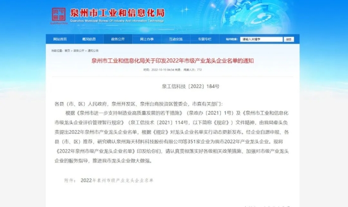 近日,泉州市工业和信息化局公布了“2022年市级产业龙头企业名单”,铁拓机械作为中国沥青混合料搅拌/沥青厂拌热再生设备专业提供商再次上榜!
